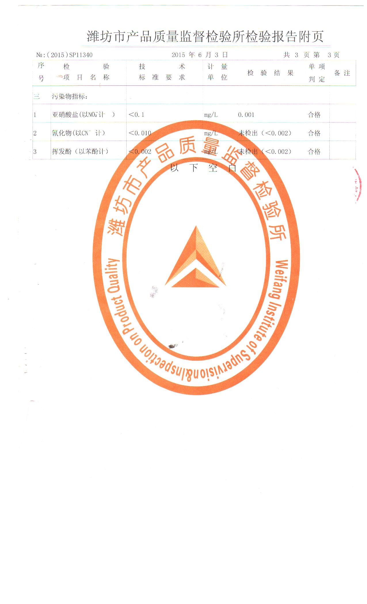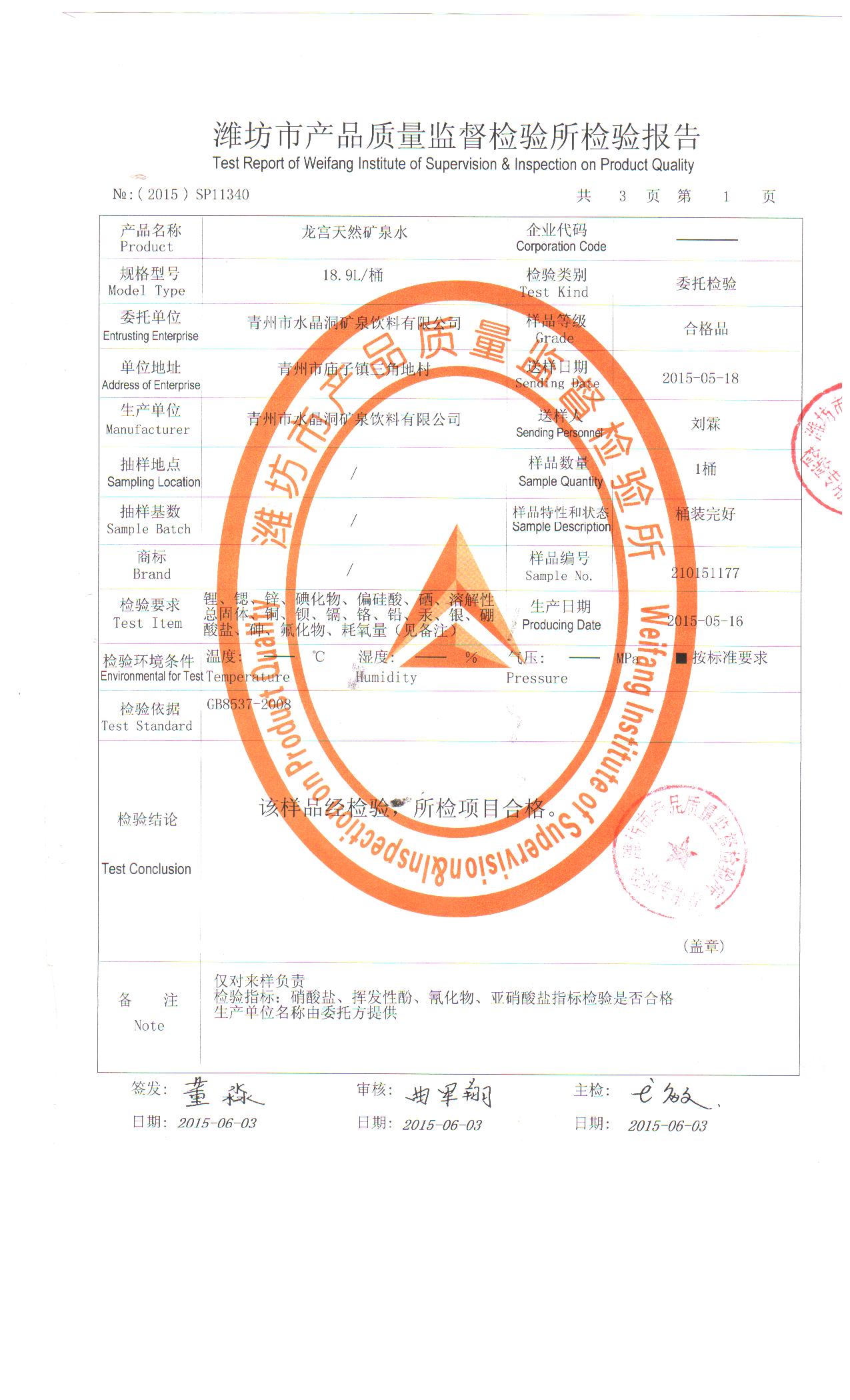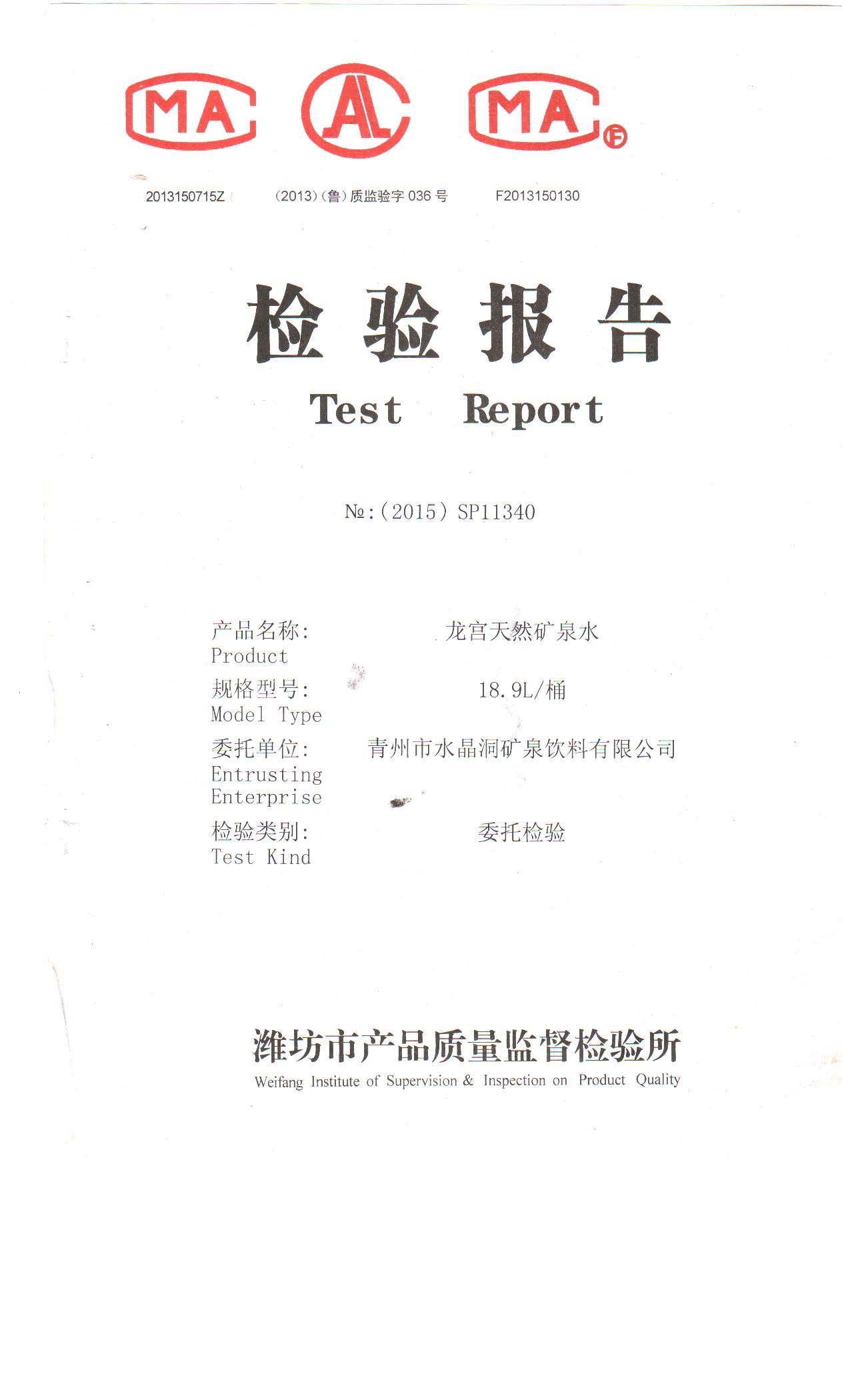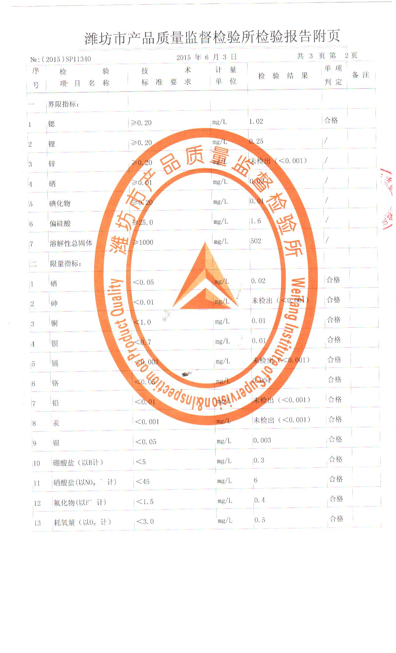 公司產(chǎn)品每年都在濰坊市產(chǎn)品質(zhì)量監(jiān)督檢驗(yàn)所進(jìn)行檢驗(yàn),2015年檢驗(yàn)報(bào)告中硒、鋰、鍶指標(biāo)均達(dá)到國(guó)家天然礦泉水標(biāo)準(zhǔn)。